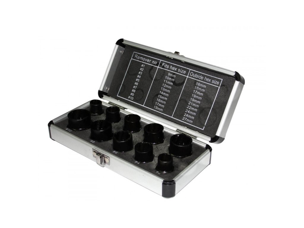 Sada špecializovaných nástrčných kľúčov pre demontáž obrobených skrutiek. Kľúče majú vo vnútri špeciálny tvar, ktorý umožňuje profilované hrany rezať do hlavy spracovanej skrutky, účinne ju blokovať a odskrutkovať. To umožní ľahko odskrutkovať skrutky, s ktorými sa bežnými nástrojmi prakticky nedá hýbať. Zvonku majú hlavice štandardný šesťhranný výrez prispôsobený na prácu s plochými kľúčmi, vďaka čomu sú extrémne univerzálne. Z dôvodu možného poškodenia hlavy skrutky je zakázané používať nástrčné kľúče s rázovým kľúčom. Proces odskrutkovania by mal byť vykonávaný opatrne.