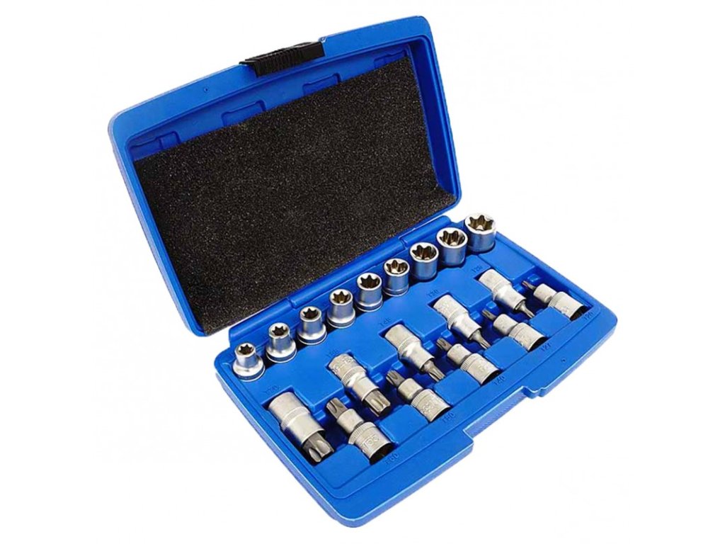 Univerzálna sada kľúčov TORX a E-TORX z vysoko akostnej ocele CrV. Sada sa skladá z 19ks nástrčiek rôznych rozmerov. Sada je balená v praktickom kufríku.