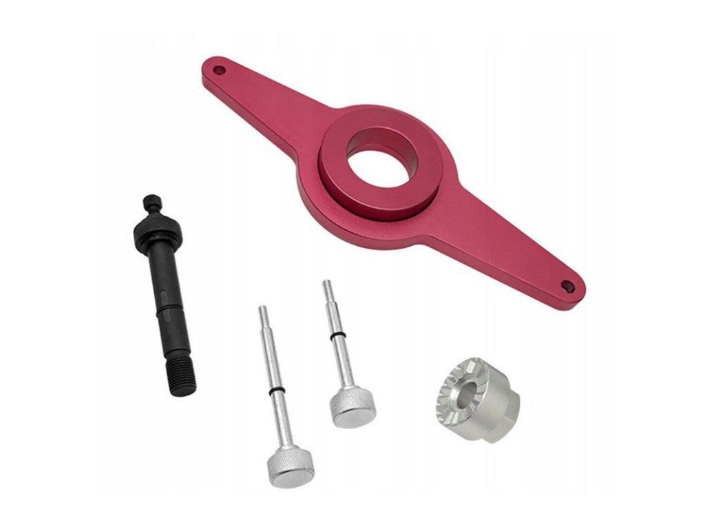 Súprava umožňuje demontáž a montáž tlmiča vibrácií a nastavenie kľukového hriadeľa. Nevyhnutná sada nutná pri blokovaní rozvodu motora, kedy je nutné demontovať tlmič vibrácií. Tlmič vibrácií u motorov VAG 1.8 a 2.0 TSi/TFSi je aretovaný na mieste centrálnou skrutkou. Stredová skrutka upína ozubené koleso rozvodovej reťaze ku kľukovému hriadeľu na mieste. Aretačné zuby na ozubených plochách a na konci kľukového hriadeľa sú držané vo svojej polohe iba zvernou silou stredovej skrutky tlmiča vibrácií. Vzhľadom na to, že na reťazovom kolese nie je klinová drážka, dôjde po odstránení centrálnej skrutky a otáčaní motora k strate polohy časovania vačkového hriadeľa. Táto špecializovaná sada obsahuje potrebné nástroje potrebné na udržanie dočasnej polohy, keď oprava vyžaduje odstránenie tlmiča vibrácií
