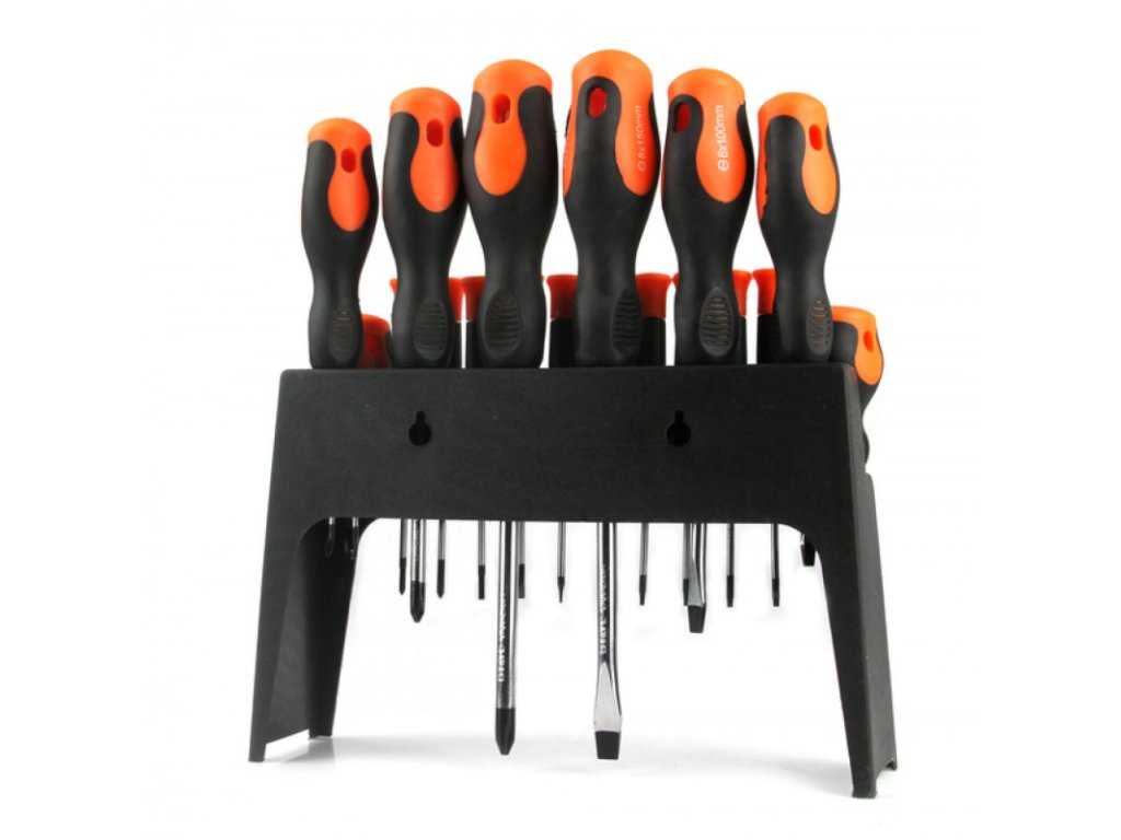 Súprava skrutkovačov CATA dobre poslúži v každej garáži alebo dielni. Priložený stojan uľahčuje skladovanie skrutkovačov. Na zadnej strane stojana sú 2 montážne otvory, ktoré umožňujú zavesiť celú zostavu na stenu.
