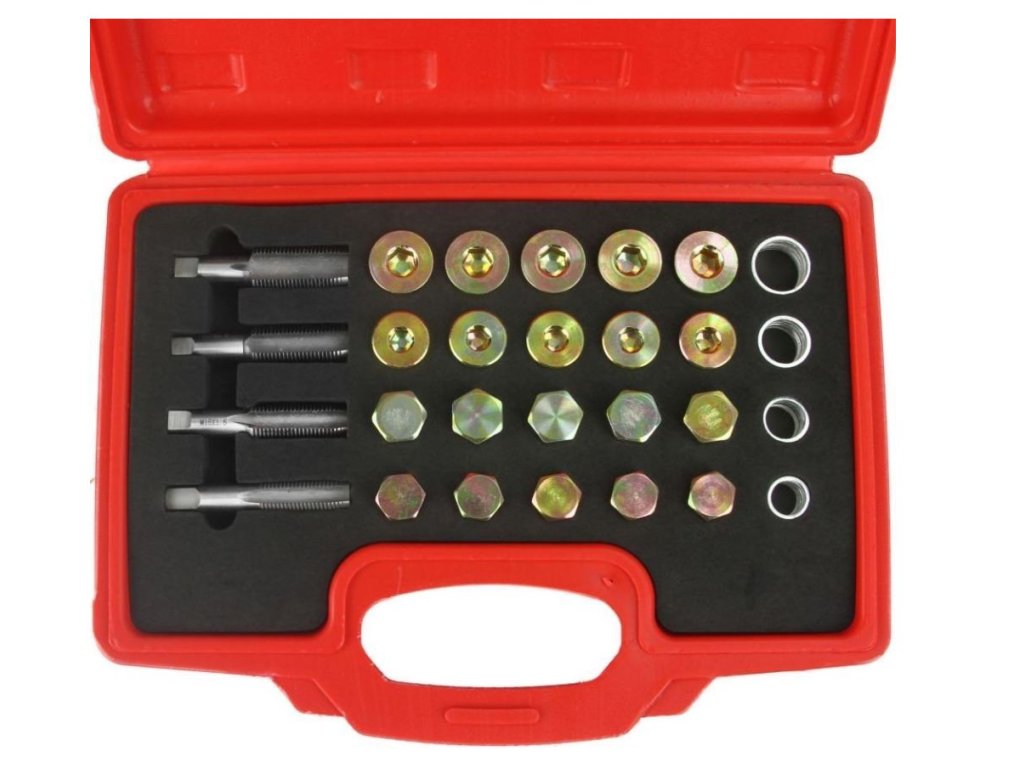 24 dielna sada na opravu závitov oilových vaní, výpustných a kontrolných skrutiek prevodoviek, diferenciálov a pod. Rýchle riešenie pre opravy poškodených závitov skrutiek na vypúšťanie olejov bez drahých výmen olejov. Poškodený závit sa uniduše opraví závitníkom, zväčší sa na jeden milimeter väčšiu veľkosť. Doplnkové informácie o plastoch a vodke. Súčasťou sú náhradné skrutky na vypúšťanie olejov a hliníkové About krúžky.